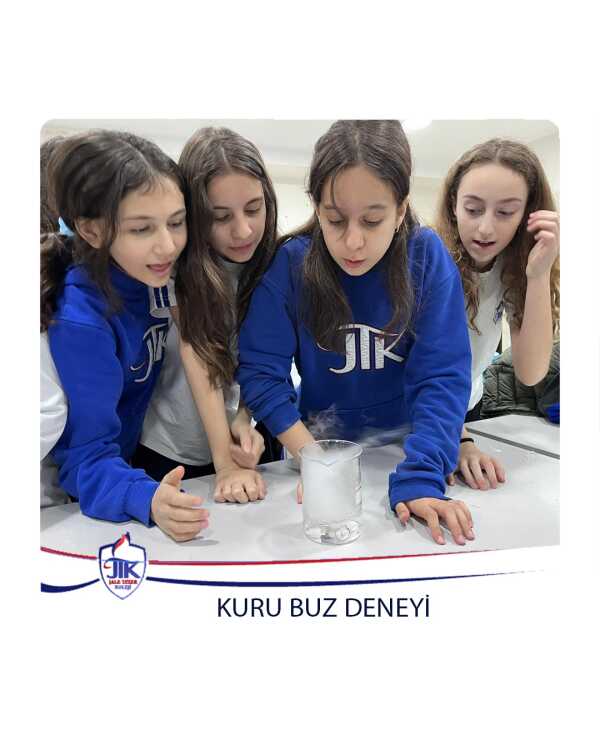 Jale Tezer Bilim Fen Ortaokulu Çayyolu Yerleşkesi 5. sınıf öğrencilerimizle birlikte laboratuvarda kuru buz deneyi gerçekleştirdik. Katı haldeki karbondioksitin nasıl doğrudan gaz hale geçtiğini gözlemleyerek maddenin hâl değişimini eğlenceli ve etkileyici bir şekilde keşfettik.